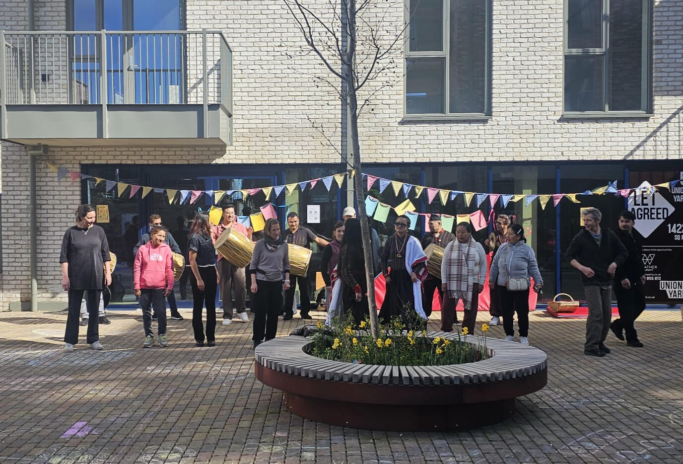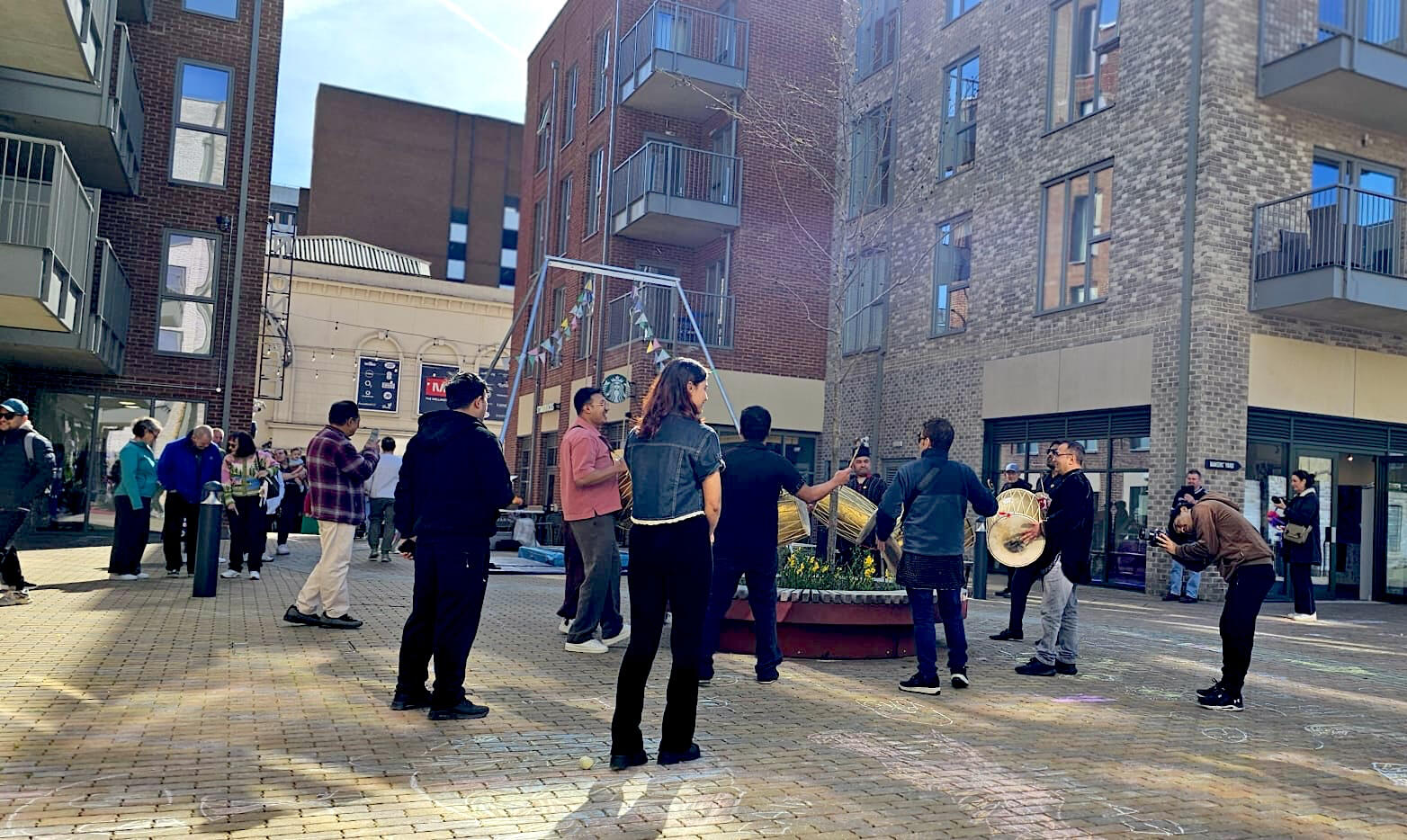 IAMFlow received a commission supported by Culture Connects from the Hampshire Cultural Trust to animate Union Yard in Aldershot, Hampshire. Thanks to the support of the Rushmoor Together Fund from Rushmoor Borough Council, we were able to run several movement and circus skills sessions for local communities two weeks before the event, boosting participation. This support also enabled us to collaborate with local artists and bring awareness to the area: Sanya Farooq offered interactive live painting sessions and drawing games throughout the day, which everyone enjoyed; we also welcomed a group of musicians and dancers from Pasa Pucha Guthi, a Newar community group, one of the many ethnic groups from Nepal.We put together the Spring Festival to align with the Spring Equinox. It was a bright and fun day with free activities for everyone, with workshops in aerial acrobatics, tight wire walking, acrobatic pyramids, juggling, dance, live art, and crafts. People could also check out the independent shops at Makers Yard and enjoy the Aldershot Craft Fayre happening just around the corner that same day.Everyone had a fantastic time, and the feedback from attendees was overwhelmingly positive. Funders and participants alike praised how the festival brought energy and creativity to the area, creating a memorable Spring celebration for all ages.