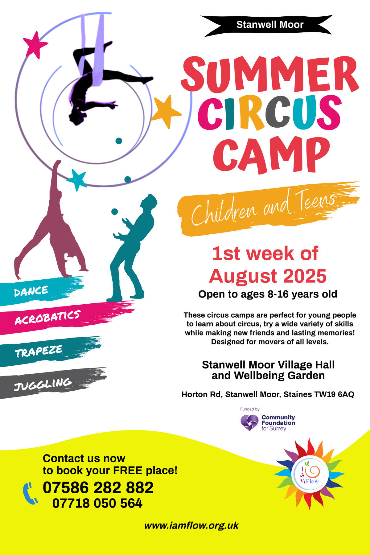 In August 2025, we ran a series of performing arts and circus skills workshops at Stanwell Moor Village Hall and Wellbeing Garden, thanks to funding from the Community Foundation for Surrey.The aim was to offer young people positive activities over the summer holidays, boosting their physical and mental wellbeing while keeping them off the streets. The programme wrapped up with informal performances for friends and family, showing off the skills they’d learned.Feedback from kids and parents praised the project for being accessible, fostering community, and boosting wellbeing. Many were eager to join again and appreciated the free, local activities. The children felt proud and keen to take part again, showing a real sense of achievement.